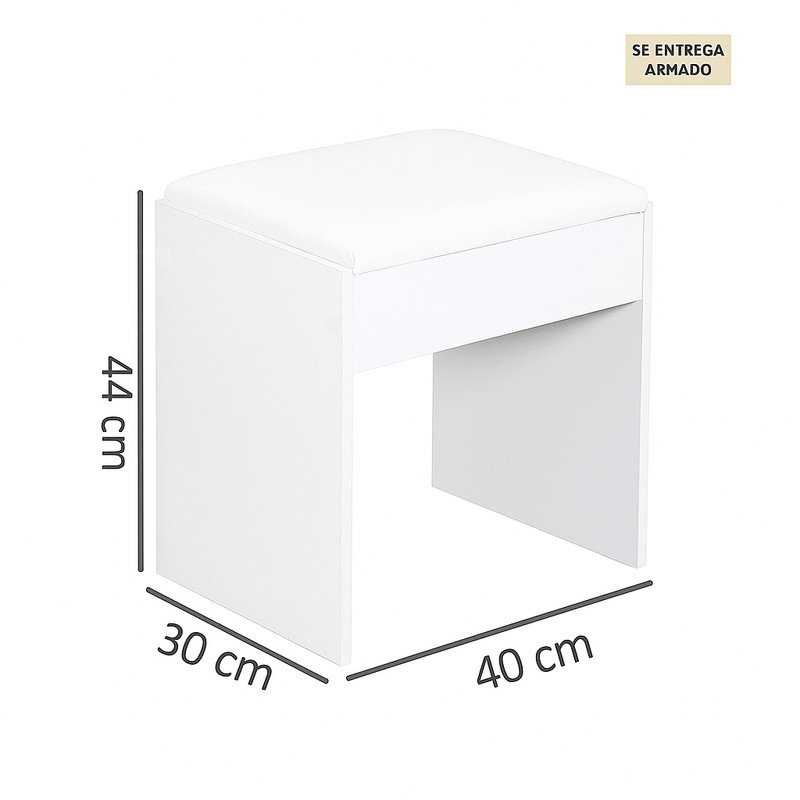 Descubre la comodidad y elegancia de nuestra silla de maquillaje para tocador, diseñada con estructura de melamina blanca y asiento tapizado acolchado. Perfecta para complementar tu peinadora o espacio de maquillaje en el dormitorio. Su diseño moderno, compacto y funcional combina con cualquier estilo de decoración. Fabricada por Muebles Crisóstomo con materiales de alta calidad. Ideal para uso diario, maquillaje, cuidado personal o decoración. Disponible con envío rápido en Lima. El producto se entrega armado.