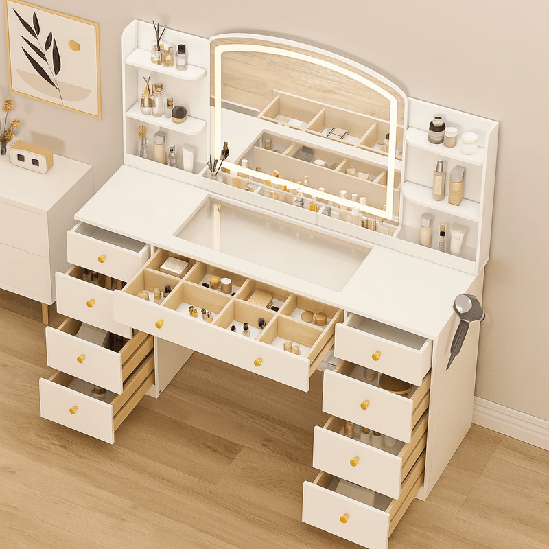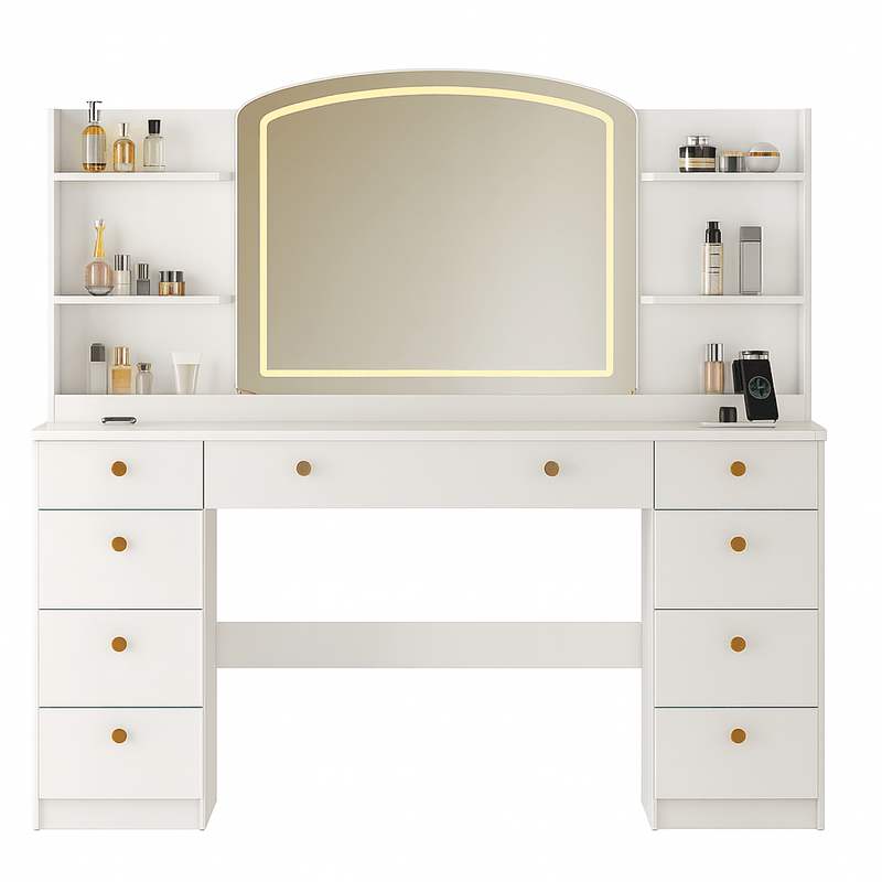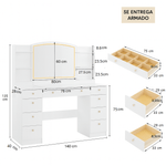 Ilumina tu rutina diaria con este elegante tocador de melamina con luces LED integradas, ideal para maquillaje, peinados y cuidado personal. Fabricado en melamina de 18 mm, resistente y fácil de limpiar, este mueble combina durabilidad y estilo moderno, perfecto para dormitorios, habitaciones juveniles y espacios minimalistas. Su espejo de gran tamaño cuenta con iluminación LED de bajo consumo, proporcionando una luz clara y uniforme, ideal para lograr resultados profesionales. Además, incorpora amplios cajones y compartimentos organizadores, pensados para mantener en orden cosméticos, perfumes, accesorios y más. 9 cajones con corredera telescópica y el producto se entrega armado.